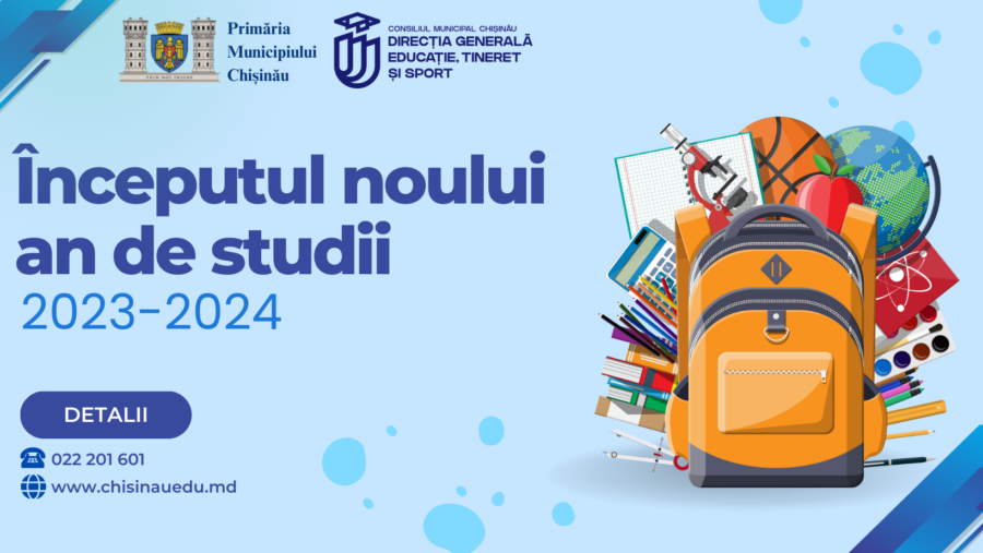 Direcția Generală Educație, Tineret și Sport a Primăriei municipiului Chișinău informează instituțiile de învățământ general și comunitatea educațională interesată, cu referire la aspectele organizatorice ale activităților tradiționale dedicate începutului noului an de studii 2023-2024, în baza circularei Nr. 03/1-09/3956 din 22.08.2023, a MEC.