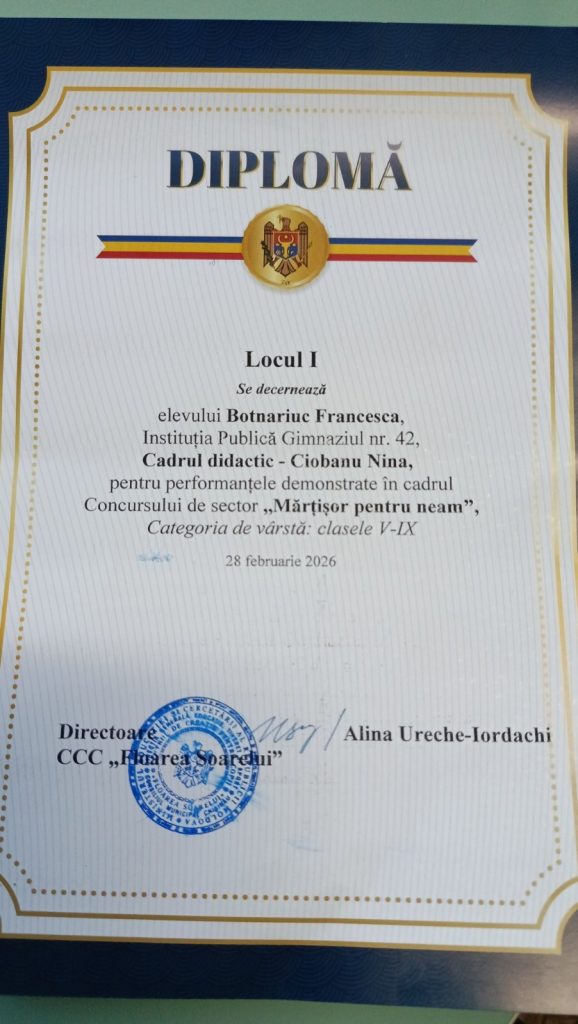 Felicitări elevei Botnariuc Francesca pentru Locul I obținut la concursul „Mărțișor pentru neam”! 🌟 Felicitări elevei Botnariuc Francesca pentru Locul I obținut la concursul „Mărțișor pentru neam”! Apreciem munca depusă și îi dorim în continuare multe succese! 👏 Felicitări și cadrului didactic Ciobanu Nina pentru îndrumare.